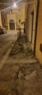 Nel piano di manutenzioni straordinarie stradali varato dalla giunta comunale di Osimo non sembrano essere state incluse risorse di bilancio per alcune strade del centro storico che richiederebbero invece un restyling anche parziale. Una di questa è via Pompeiana, soprattutto nel tratto finale compreso tra l’intersezione con via Scalette e con quella di via Matteotti. Meno di 50 metri di striscia di asfalto del passaggio pedonale a margine della carreggiata a senso unico, punteggiati di buche anche profonde che rendono complicato e pericoloso il transito di chi li percorre a piedi. Alessandro Buccelli, ex coordinatore di Fi-Cdo di Osimo, torna a segnalare le insidie di questa via d’uscita dal centro città che potrebbero essere cancellate stanziando un imvestimento minimo di soldi pubblici.