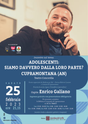 Il Comune di Cupramontana ospiterà Enrico Galiano sabato prossimo, 25 febbraio alle ore 21.15, al Teatro Concordi. L’evento, intitolato “Adolescenti: siamo davvero dalla loro parte?” è organizzato dal Comune, da Medicina per Me! e dalla Mental Life Coach e coach adolescenziale Roberta Cesaroni. «Dopo un periodo in cui ho cercato di comprendere le esigenze dei nostri adolescenti e soprattutto di trovare proposte adeguate alle loro richieste, mi sono domandata se veramente i nostri ragazzi hanno bisogno di nuove proposte per organizzare il loro tempo o di opportunità di confronto e scambio di punti di vista. Noi adulti ascoltiamo veramente la loro voce o cerchiamo di accontentarli anticipandone sempre le richieste? Le nostre idee corrispondono alle loro necessità? – afferma in una nota la vice sindaca Stefania Sorana motivando il perché dell’incontro pubblico con Enrico Galiano – Dopo la mia riflessione ho ritenuto opportuno cambiare punto di vista e attivarmi per organizzare un percorso per costruire nuove relazioni tra adolescenti e l’intera comunità».