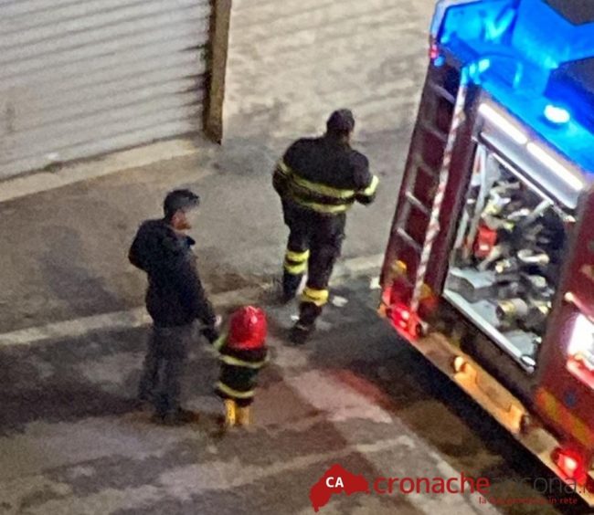 Vestito con il giubbetto dei vigili del fuoco, casco rosso da caposquadra sulla testa e un piccolo estintore stretto in mano ha atteso in strada, assieme al papà, l’arrivo emozionante del camion dei pompieri con tanto di lampeggianti blu accesi.