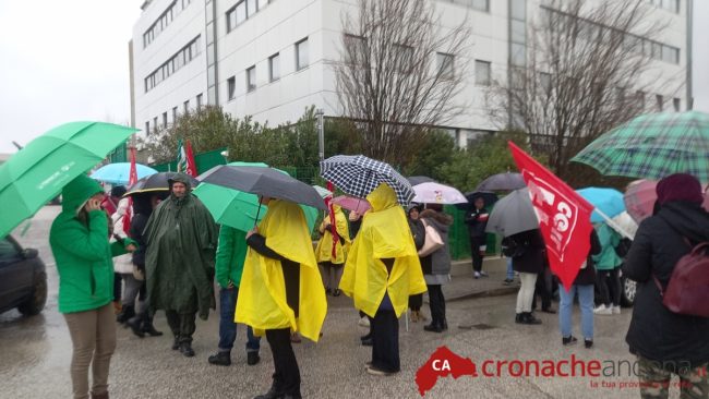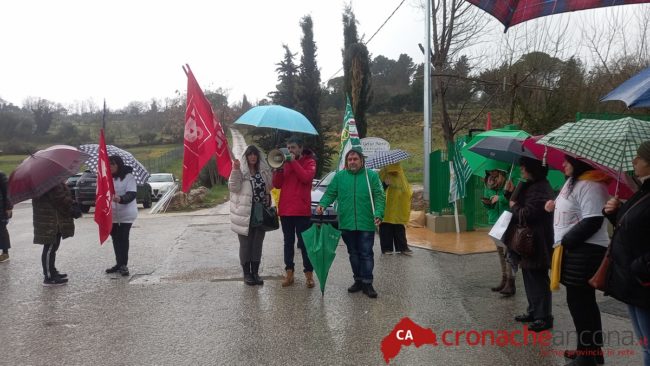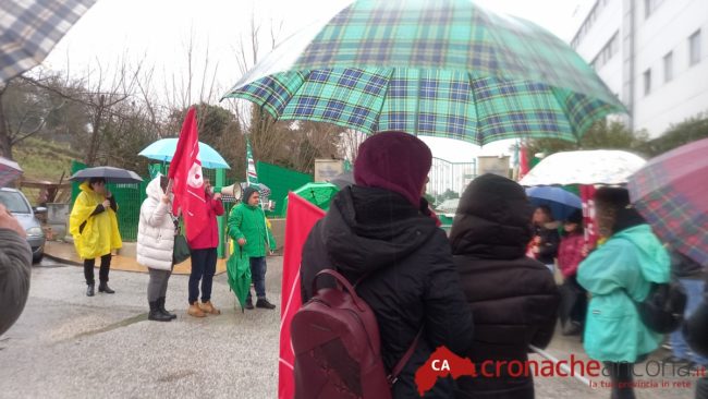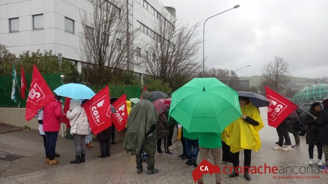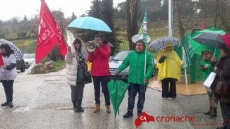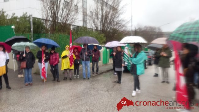 Protesta sotto la pioggia battente per i lavoratori della Residenza Dorica. Stamattina, poco dopo le 10, una rappresentanza dei dipendenti della struttura residenziale per anziani che fa parte del gruppo Kos si è riunita davanti ai cancelli di via Primo Maggio per contestare le nuove turnazioni in vigore da oggi, con «carichi di lavoro maggiori per i lavoratori e più giornate lavorate nell’anno», spiega Marco Paglialunga, segretario generale Fisascat Cisl Marche.