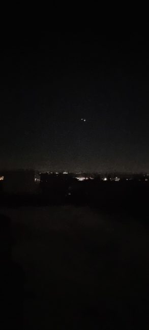 Droni, satelliti Starlink o aerei? No, era solo un meraviglioso spettacolo planetario quello che è andato in scena nella serata di ieri: Giove e Venere erano vicinissimi e si sono profusi in ‘bacio’ celeste. Le due luci potenti che brillavano nell’oscurità, visibili a occhio nudo, sono state immortalate dall’obiettivo di Alessandro Buccelli dalla prospettiva della campagna di Campocavallo di Osimo. Ma la bellezza dei due pianeti, in stretta congiunzione, l’1 marzo è stata osservata con curiosità (ma anche stasera 2 marzo sarà possbile farlo) e ammirata da molte altre località delle Marche.