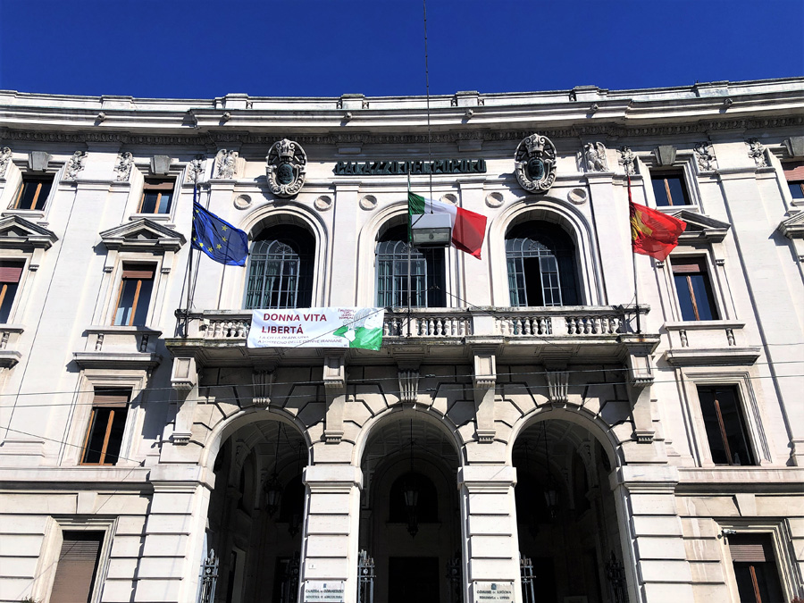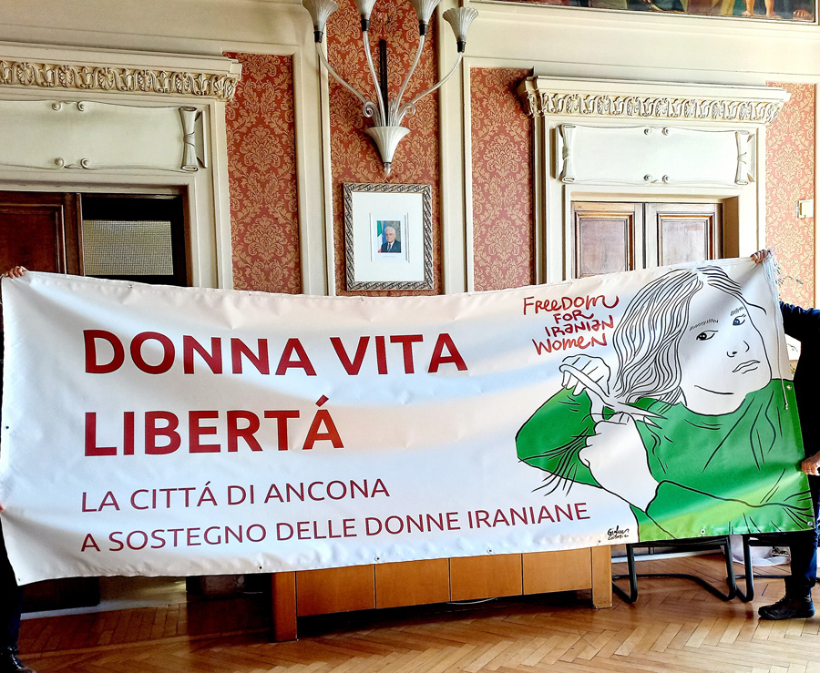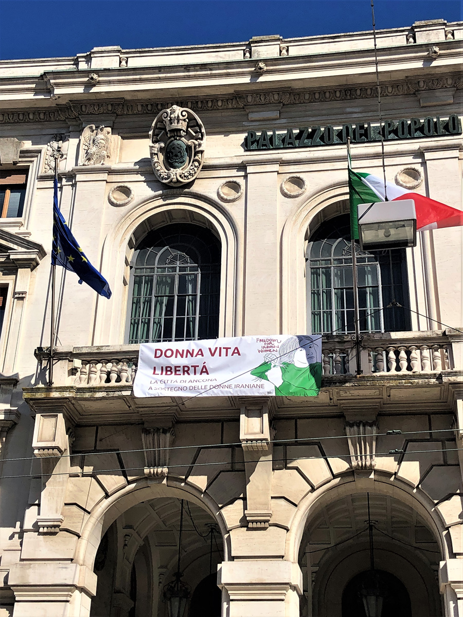 “Donna, Vita, Libertà a sostegno delle donne iraniane”, lo slogan intonato ormai in tutto il mondo e che guida la straordinaria mobilitazione di protesta che sta attraversando la società iraniana, da oggi è visibile su uno striscione appeso sulla facciata del Comune di Ancona.« Con questo atto, frutto di una delibera di Giunta, l’Amministrazione a nome dei cittadini dorici, vuole sottolineare così la condanna nei confronti delle violenze operate dalle autorità iraniane contro manifestanti pacifici» spiega una nota del comune di Ancona.