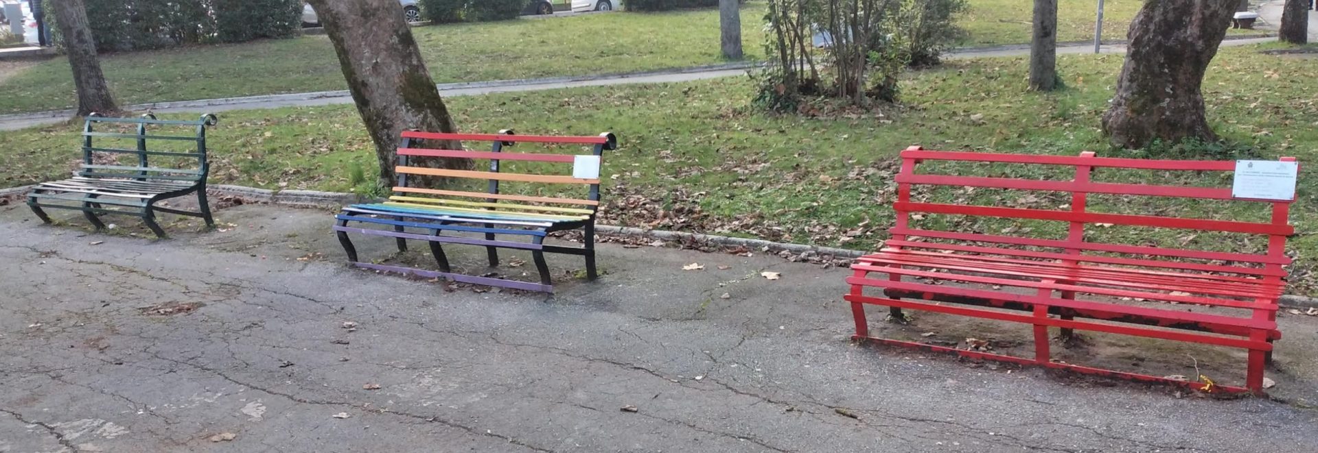 Parco Regina Margherita di Fabriano, a sinistra la panchina che il consigliere Pino Pariano chiede di dipingere di bianco