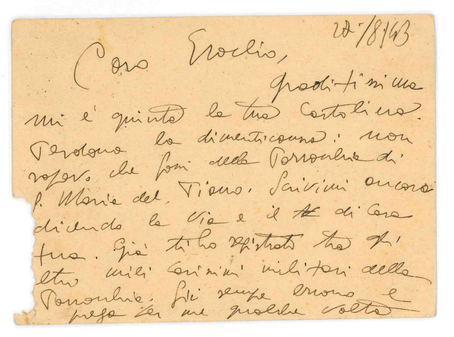 «Nei giorni scorsi, infatti, il Comune di Jesi ha ricevuto in dono e custodia una cartolina che Cappannini ricevette nell’agosto 1943 da don Ezio Balestra, cartolina poi ritrovata nei libri di scuola del partigiano, assassinato dai nazifascisti il 5 maggio 1944.- fa sapere una nota dell’ente locale – Di seguito le parole del nipote Vittorio Graziosi: “Quando lessi il testo della cartolina rinvenuta tra le pagine di un testo scolastico del partigiano Eraclio Cappannini ebbi da subito l’impressione che Eraclio – mio zio – l’avesse custodita con cura come si fa con le parole scritte da un amico prezioso. Don Balestra era premuroso verso il giovane Cappannini, forse anche accorato nel chiedere informazioni e nel farsi promettere che sarebbe andato a trovarlo. Per questo, non potevo tenere la cartolina per me e che dovesse essere donata alla cittadinanza, così come io e i miei parenti tutti abbiamo già fatto con la lettera, la medaglia al valore e la divisa. Questa cartolina è la testimonianza che noi jesini in momenti di difficoltà siamo premurosi e solidali. Confido che questo atteggiamento ci contraddistingua sempre.” L’Amministrazione comunale ringrazia e assicura la massima cura e attenzione verso la memoria di un concittadino così importante il quale, in punto di morte, scrisse “Siate forti come lo sono stato io“».