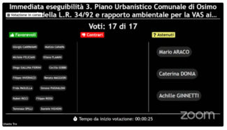 «Stiamo pianificando la Osimo del futuro, moderna, sostenibile, concreta, all’insegna della rigenerazione.- ha commentato il sindaco Simone Pugnaloni al termine della seduta consiliare – Dopo la lunga fase di partecipazione democratica, stasera il Consiglio ha adottato il Piano Urbanistico comunale. Peccato per il mancato contributo di parte delle minoranze, assenti in blocco alla discussione. Ora dopo la pubblicazione, ci saranno 60 giorni di tempo per recepire le osservazioni di cittadini ed imprese, poi nuovo passaggio in Sala Gialla per l’adozione definitiva prima di mandare il Puc in Provincia. Approvazioneo definitiva entro marzo 2024. Un ringraziamento speciale all’Assessore all’Urbanistica Annalisa Pagliarecci che con me ha condiviso questo percorso delicato, dettagliato, paziente che ci ha visto protagonisti con decine di riunioni con uffici, categorie e cittadini e che ha cercato di rispondere a pieno alle istanze giunte dalla cittadinanza, 161 pervenute ai nostri uffici. Un encomio a nome mio e di tutta l’amministrazione al dirigente Architetto Manuela Vecchietti, al Professor Giovanni Marinelli dell’Universita Politecnica delle Marche ed a tutto lo staff presente stasera per averci donato questa nuovo modo di vedere la nostra citta’ proiettata urbanisticamente nel futuro».
