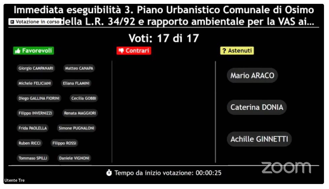 E’ approdata ieri sera in Consiglio comunale la prima adozione del Piano Urbanistico Comunale di Osimo finalizzata al riassetto urbanistico-ambientale del territorio comunale e al rapporto ambientale per la Vas. L’atto è stato approvato con 14 sì di maggioranza, hanno espresso voto di astensione i consiglieri d’opposizione Mario Araco, Caterina Donia e Achille Ginnetti, Assenti in aula i rappresentanti delle Liste civiche che hanno aderito alla protesta formalizzata con lettera dal collega Stefano Simoncini per i tempi risicati lasciati agli stessi consiglieri e ai tecnici per approfondire l’analisi dei contenuti del nuovo strumento urbanistico.