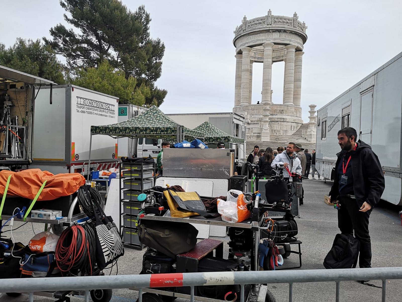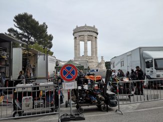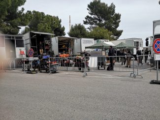 Sullo spiazzo davanti al monumento ai caduti, la carovana di camion e camper è arrivata all’ora di pranzo. Un brulicare di voci dall’accento romano e oggetti trascinati. Telecamere, microfoni, cavi e supporti, caricati su appositi carrelli spinti fino all’ascensore, riservato per l’occasione. Sopra, in uno spazio transennato, restano vestiti e scarpe, trucchi e spazzole.