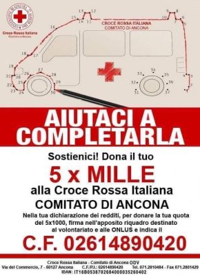 «Mentre compili la dichiarazione dei redditi ricordati di destinare il 5 per mille dell’Irpef alla Croce Rossa Italiana Comitato di Ancona, sarà il primo passo per aiutarci con un gesto concreto a svolgere i nostri servizi di assistenza sanitaria, di pronto intervento, di aiuto alle persone in difficoltà economica e di sostegno alle famiglie e ai bambini in situazioni di disagio».