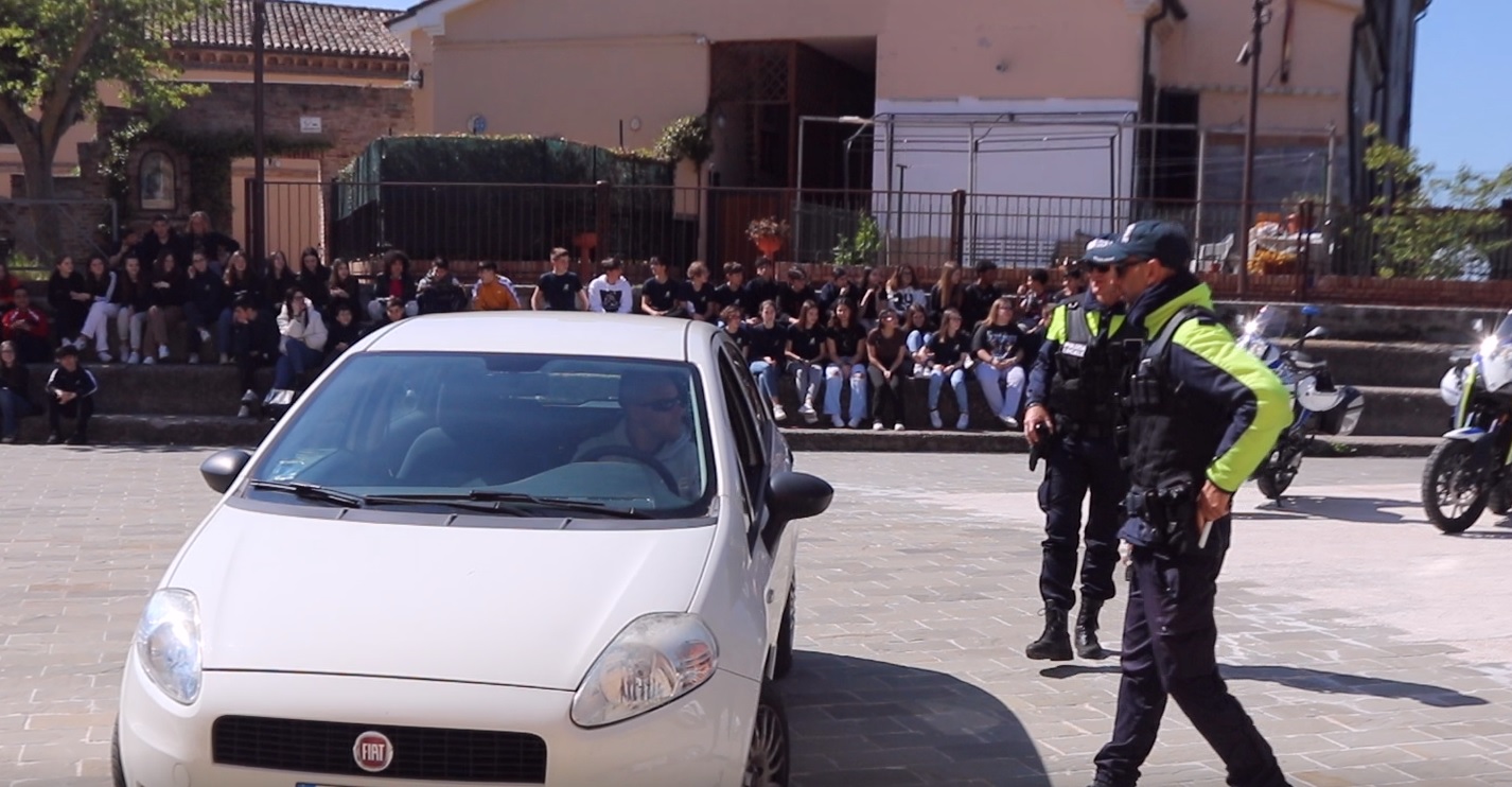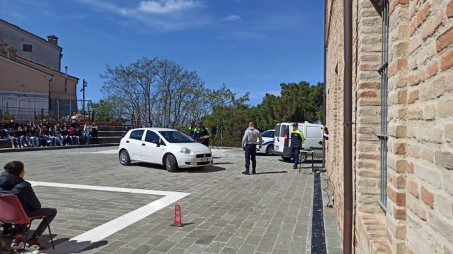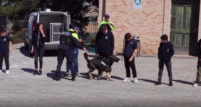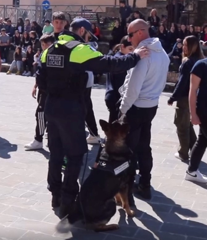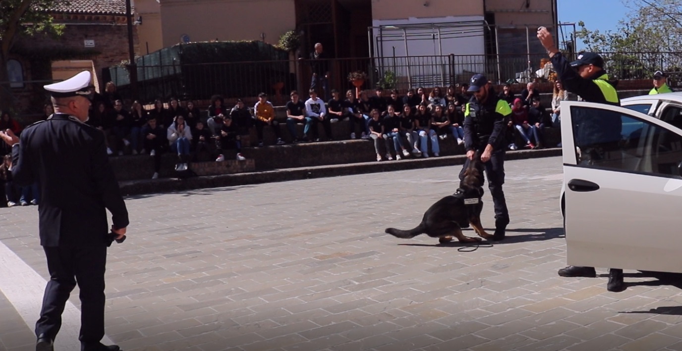 Dopo la presentazione della giornata, i saluti e ringraziamenti della dirigente scolastica Monica Marchiani, e del comandante della Pl di Castelfidardo, Paolo Tondini, dalle parole si è passati all’azione che ha visto Billy impegnato nella ricerca di droga dapprima nel corso di un normale controllo di una vettura cui era stato intimato l’alt dal nucleo motociclisti della Polizia locale, per poi confermare la sua abilità anche nella seconda scena simulata, quella di un comune luogo di aggregazione giovanile frequentato da una trentina di studenti e raggiunto da uno pseudo spacciatore, subito intercettato dall’infallibile fiuto del pastore tedesco. La brillante performance del nucleo cinofili è stata poi confermata anche nell’ultimo degli esercizi in programma, quella della simulazione di un controllo a bordo di una mezzo pubblico dove Billy è passato in rassegna ad un gruppo di studenti, bloccandosi immediatamente al cospetto del solito pseudo spacciatore -interpretato sempre da un agente in borghese- che deteneva nel marsupio la sostanza stupefacente.