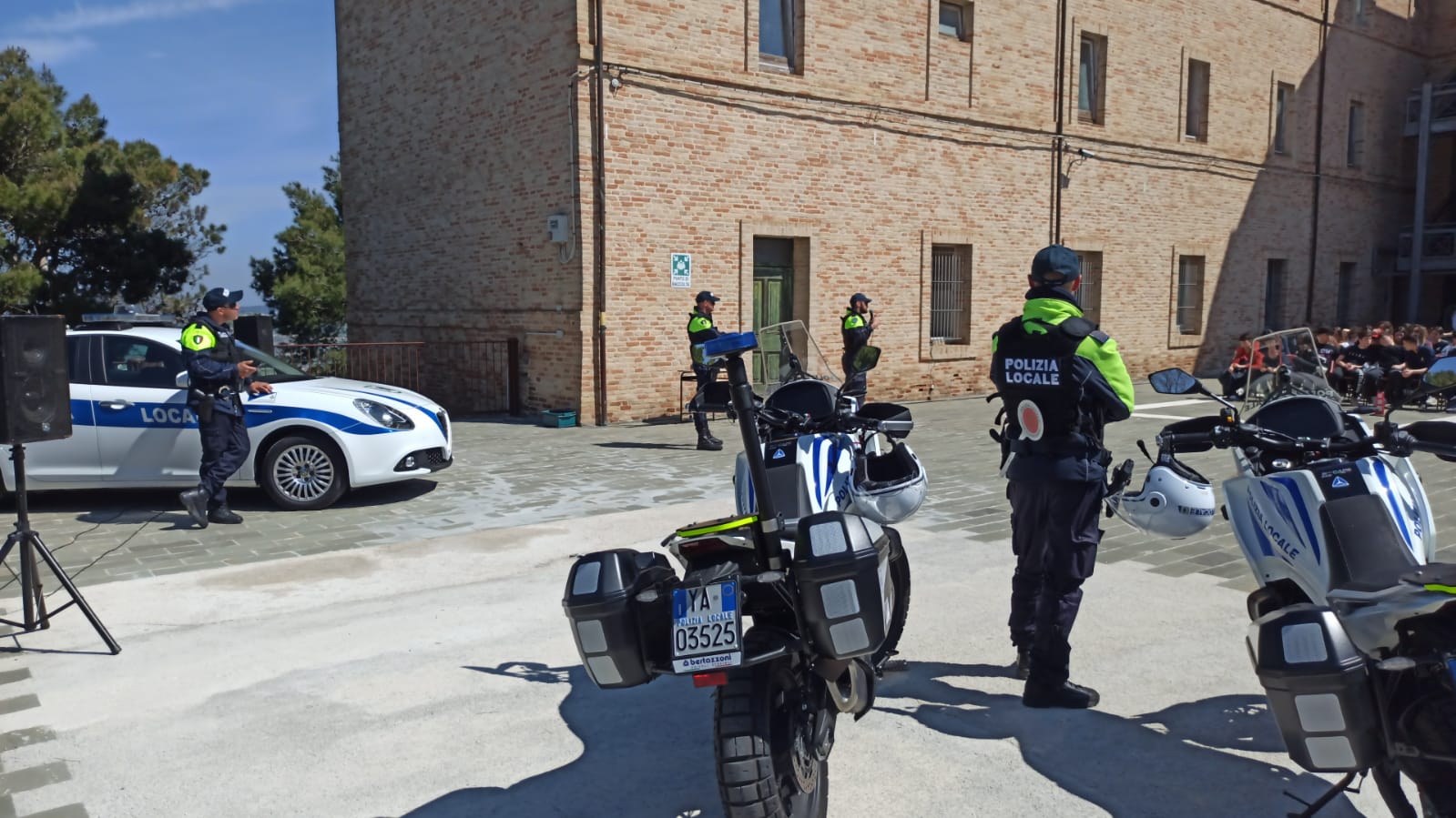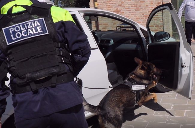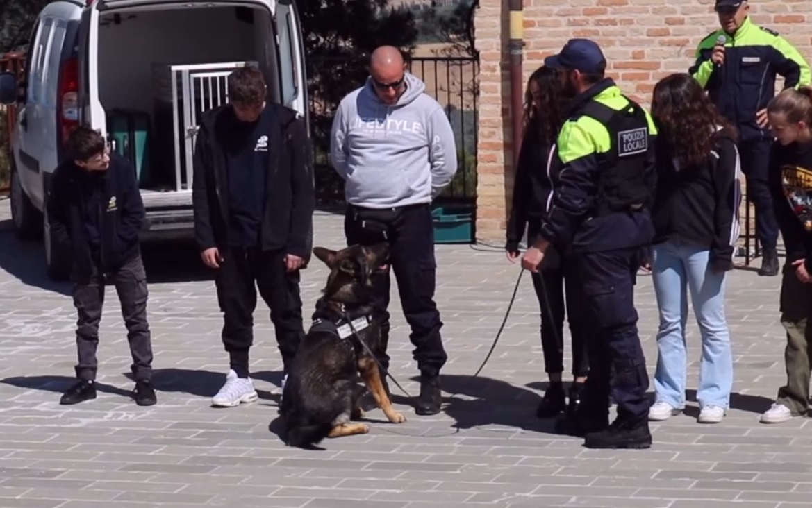 Una settimana intensa per gli uomini e le donne della Polizia locale di Castelfidardo e Camerano che dalle aule degli istituti scolastici si sono spostati negli ambienti esterni. Dapprima si sono ritrovati presso la pista “Scarponi” dove gli allievi si sono cimentanti con delle vere e proprie prove di guida a bordo di bici e macchine a pedali, in un percorso stradale appositamente studiato e realizzato dall’Ufficio Tecnico comunale di Castelfidardo, corredato di segnali di ogni tipo e perfino di un impianto semaforico. Oggi l’appuntamento era nella rinnovata Arena IV Luglio prospiciente le scuole medie della città della fisarmonica, per l’esercitazione dell’unità cinofila antidroga di stanza presso il Comando della Polizia locale di Tolentino, che ha suggellato il completamento del percorso di educazione alla legalità promosso in seno al progetto “Scuole Sicure” del Ministero dell’Interno e Prefettura di Ancona. Una cornice entusiasta di circa 200 studenti delle classi terze medie degli istituti comprensivi “Mazzini” e “Soprani” ha fatto da sfondo alle performance di Billy, un bellissimo pastore tedesco che dopo un anno di specifico addestramento compiuto unitamente al suo conduttore, assistente capo della Polizia Locale Giorgio Aringoli, è adesso a tutti gli effetti un cane arruolato nei ranghi della polizia locale poiché capace di scovare sostanze stupefacenti in ogni contesto e luogo ove queste possano essere occultate per sfuggire ai controlli delle forze dell’ordine.