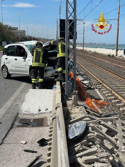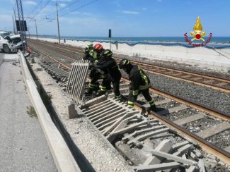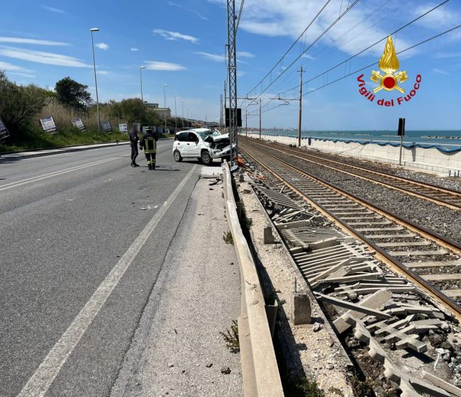 Stando alle prime informazioni un’auto, una Panda, è uscita di strada, abbattendo poi per una ventina di metri il muretto in cemento che divide la carreggiata dalla linea ferroviaria, facendo schizzare i pezzi lungo i binari.