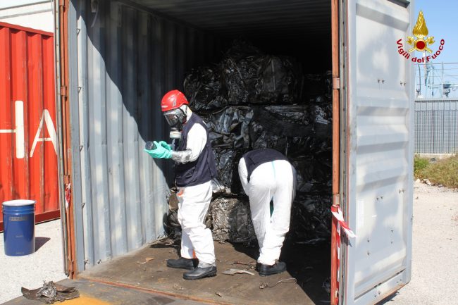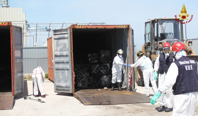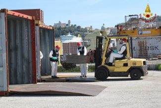 Intervento dei vigili del fuoco al terminal Container del porto di Ancona per il recupero di una sorgente radioattiva (Cobalto 60) individuata all’interno di un container contenente rottami ferrosi.