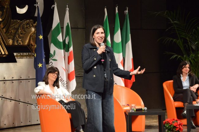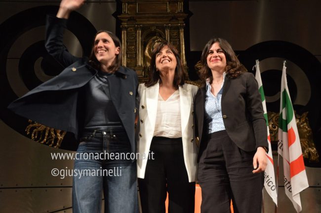 È stato un continuo di applausi e standing ovation al teatro delle Muse, dove Elly Schlein ha da poco terminato il comizio tenuto per sostenere la candidatura a sindaca di Ida Simonella e i candidati del Partito Democratico in lista alle comunali in programma domenica e lunedì prossimi.