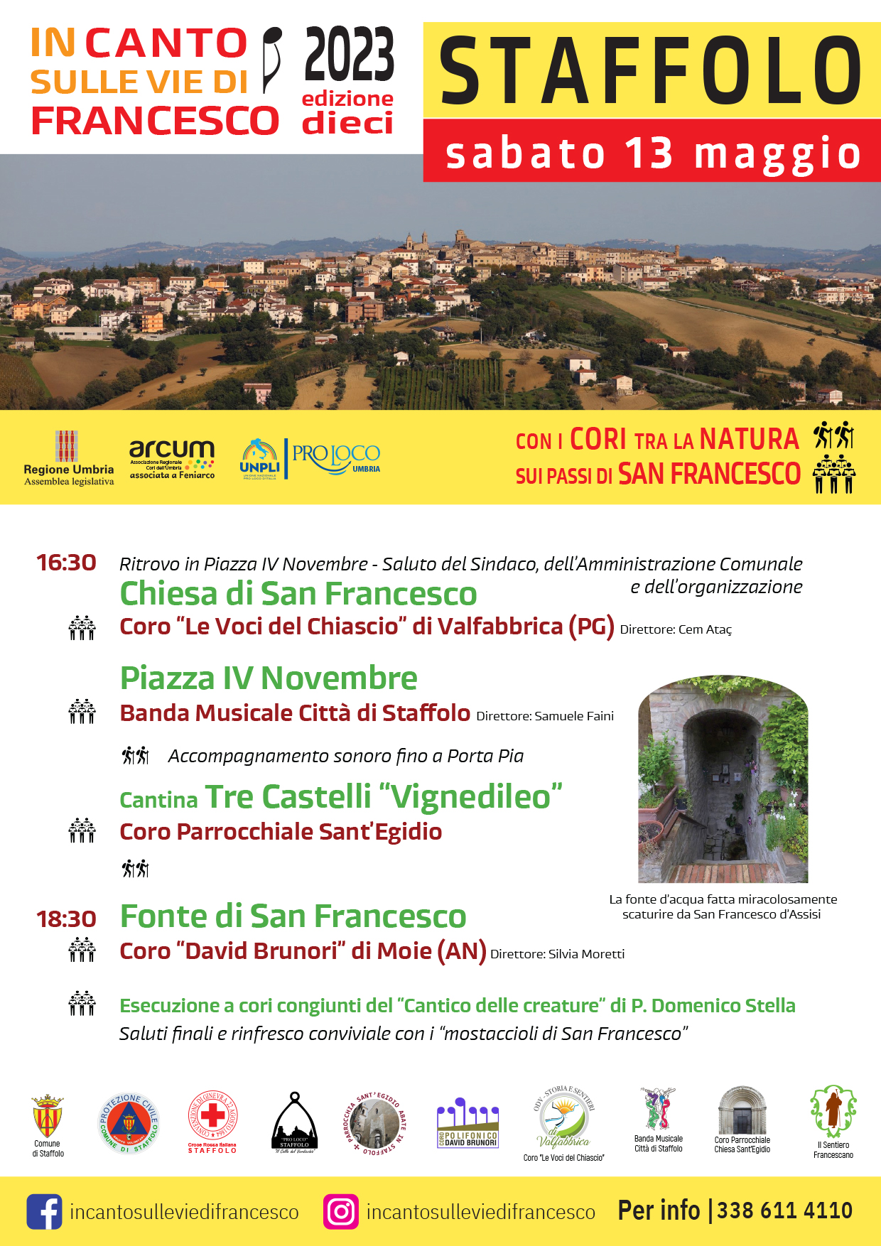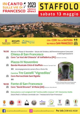 Per la seconda volta, dopo l’edizione di successo dello scorso anno, “InCanto sulle Vie di Francesco”, serie di eventi che, patrocinata dalla Regione Umbria e numerose altre istituzioni, spazia tra Umbria, Toscana e Marche, torna sabato 13 maggio pomeriggio nella “francescanissima” Staffolo. L’iniziativa, giunta al suo decimo appuntamento, prevede di percorrere a piedi un tratto di un antico percorso francescano facendo tappa, di tanto in tanto, in luoghi significativi in ognuno dei quali un coro o altra realtà musicale propone l’ascolto di alcune proprie esibizioni. Quella di Staffolo è in programma per domani, 13 maggio.