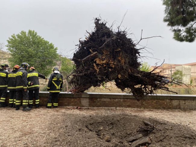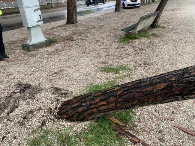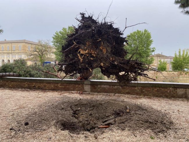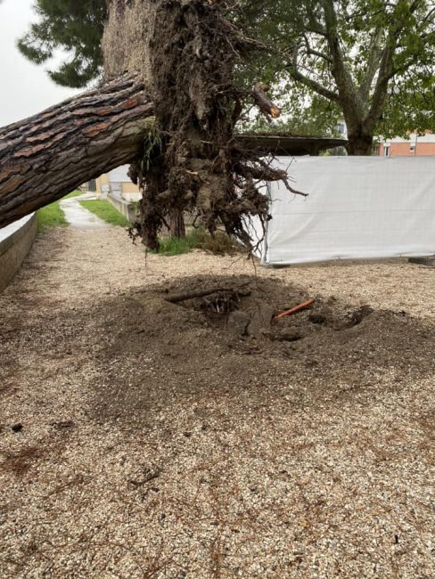 «Poco fa sono caduti, uno dietro l’altro, due pini che si trovavano nell’area adiacente il vecchio lavatoio comunale in via Rossini».