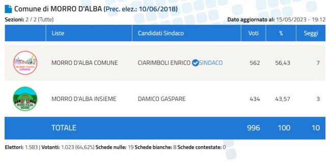 Enrico Ciarimboli sindaco bis di Morro d’alba. Il primo cittadino uscente di 55 anni alla guida della lista ‘Morro d’Alba Comune’, resterà per i prossimi 5 anni al timone del paese, forte del consenso del 56,43% tributatogli dalle urne. Nel 2018 Ciarimboli aveva ottenuto il 53,44% dei consensi e 550 voti. Con 562 preferenze oggi pomeriggio il neo eletto ha superato l’avversario Gaspare Damico, 69 anni, sostenuto dalla lista ‘Morro d’Alba insieme’ attestatosi al 43,56% con 434 voti. Una elezione molto sentita e combattuta quella del paese del vino ‘Lacrima’, uno dei borghi più belli d’Italia, che ha visto esprimere il 64,62% dei 1.583 aventi diritto al voto. Sette i seggi conquistati dalla lista di maggioranza in Consiglio comunale, 3 quelli d’opposizione.