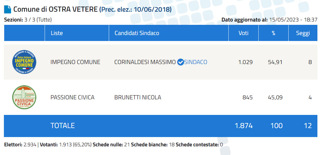 Con Massimo Corinaldesi, alla guida della lista civica ‘Ostra Vetere Impegno Comune’, il centrodestra conquista il governo di Ostra Vetere dopo 10 anni. Il neo sindaco, presidente del locale circolo di Fratelli d’Italia, attuale delegato regionale presso Atc An1 e delegato provinciale Politiche Ambientali Agricole Caccia e Pesca, ha battuto con 1.029 voti e il 54,91% dii preferenze in questa competizione elettorale l’ex sindaco (per diversi mandati tra 1985 e il 2004) Nicola Brunetti, alla guida della lista civica ‘Passione Civica’ che si è fermato a 845 preferenze, pari al 45,09% dei consensi. Entrambi si contendevano i voti dei 2.934 elettori. Sono entrati in cabina in 1.913 (il 65,20%) ed hanno consegnato la maggioranza dei 12 seggi consiliari, 8 in tutto alla lista del sindaco Corinaldesi, lasciando i restanti 4 all’opposizione di Brunetti.