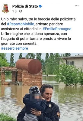Ad oggi, rileva Bufarini «i colleghi sono impiegati nei soccorsi con un contingente di 20 – 30 unità giornaliere, nelle zone di Lugo, Castel Bolognese, Massa Lombarda in servizi mirati alla messa in sicurezza delle persone anziane, bambini, mamme e disabili e persone molto gravi allettate che, prelevate dai mezzi anfibi dei vigili del fuoco e della protezione civile, vengono portati in locali sicuri e di prima accoglienza come scuole o palestre». Il sindacalista continua sottolineando che l’immagine di una poliziotta del XIV Reparto Mobile di Senigallia, inserita nel sito Fb ufficiale della Polizia di Stato che con in braccio un bambino, lo porta in una zona tranquilla insieme al proprio genitore, «certifica l’impegno quotidiano delle donne e degli uomini della Polizia di Stato e sintetizza, in uno “scatto”, l’encomiabile lavoro giornaliero svolto in “silenzio” e con molte difficoltà dai tali colleghi. Ecco perché, da cittadino e poliziotto, sono orgoglioso di tale Istituzione. Alla pari di un territorio “trascurato”, in cui la natura si riprende gli spazi, l’auspicio è che la politica valorizzi sempre più la Sicurezza con personale e mezzi, come investimento e non un costo, in cui la prevenzione deve diventare l’attività quotidiana e prioritaria» conclude il segretario del Siulp Ancona.