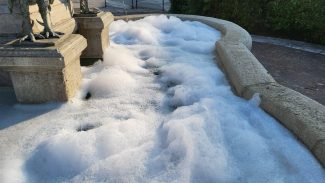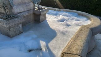 La fontana di piazza dei Galli riempita completamente di schiuma.