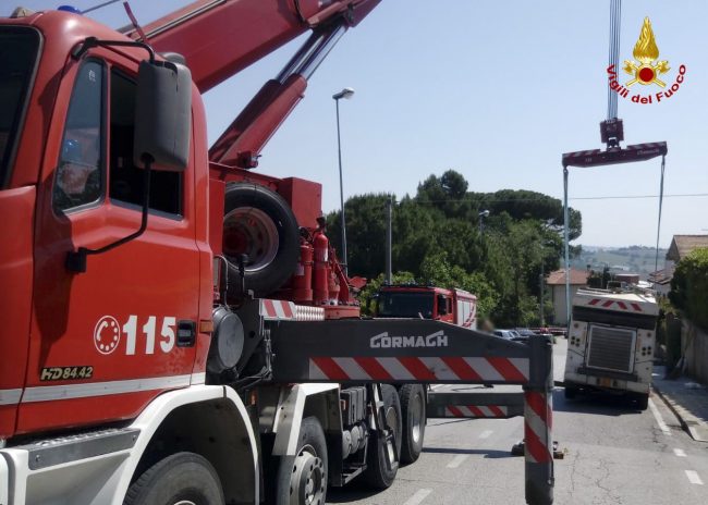 La squadra di Osimo, in collaborazione con i colleghi dell’autogru partiti dalla centrale di Ancona, hanno provveduto ad ad alzare il mezzo e ad estrarlo dalla voragine che si era creata nel frattempo..