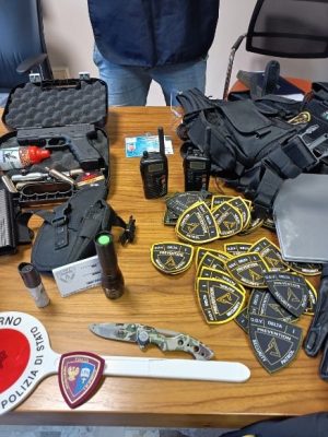 Durante le operazioni di perquisizione sono stati trovati e sequestrati numerosi oggetti quali: divise, gagliardetti, tessere di iscrizione all’associazione, spray al peperoncino e una pistola ad aria compressa, utilizzati dagli indagati per effettuare l’attività di vigilanza abusiva, tra cui un furgone verde militare, allestito da ufficio mobile, dove uno dei due indagati custodiva anche uno sfollagente telescopico in acciaio di colore nero, come quelli in dotazione ai carabinieri.