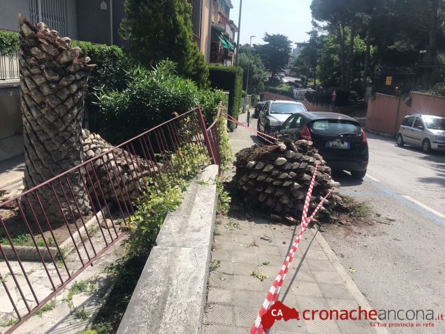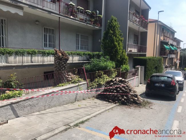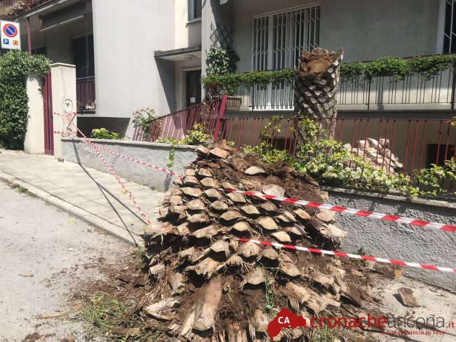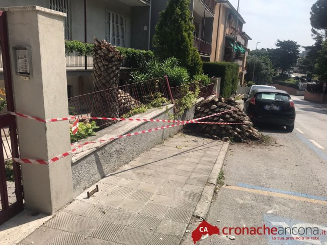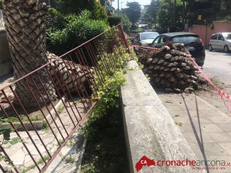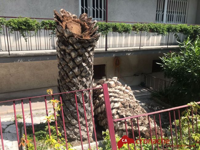 Nel cadere, la pesante palma ha piegato e rotto la ringhiera che delimita la proprietà condominiale. A causare il crollo potrebbe essere stato il punteruolo ma anche la pioggia abbattutasi nei giorni scorsi in città.