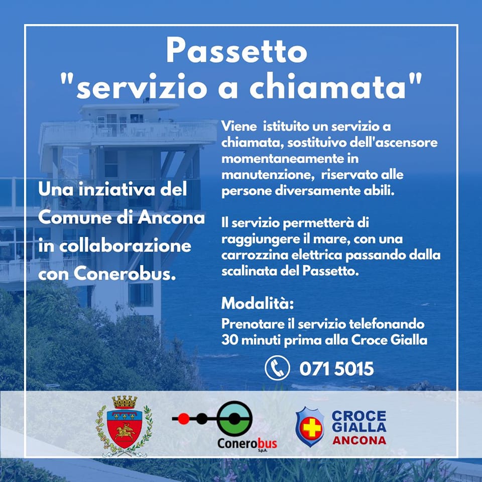 Il comune di Ancona corre ai ripari per ovviare all’inconveniente temporaneo del guasto all’ascensore del Passetto e per garantire proprio a tutti il raggiungimento della spiaggia sottostante, superando ogni barriera architettonica. In collaborazione con Conerobus, l’ente locale ha deciso di attivare un servizio a chiamata riservato alle persone diversamente abili e sostitutivo dell’elevatore momentaneamente in manutenzione. Il servizio, reso opereativo in collaborazione con la Croce Gialla Ancona, permetterà di raggiungere il mare con una carrozzina elettrica passando dalla scalinata del Passetto.