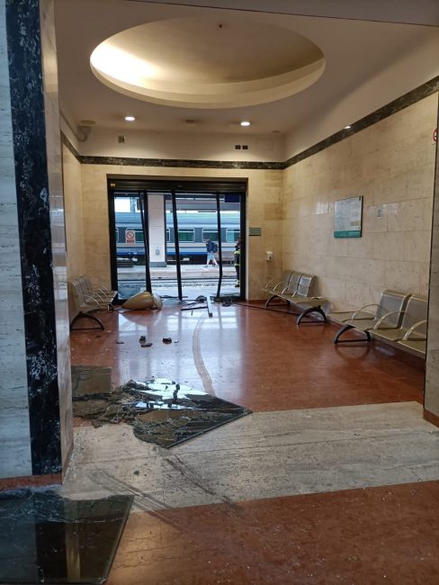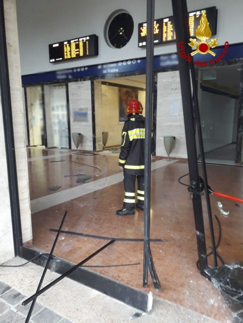 La vetrata sfondata dall’auto nell’entrare in stazione