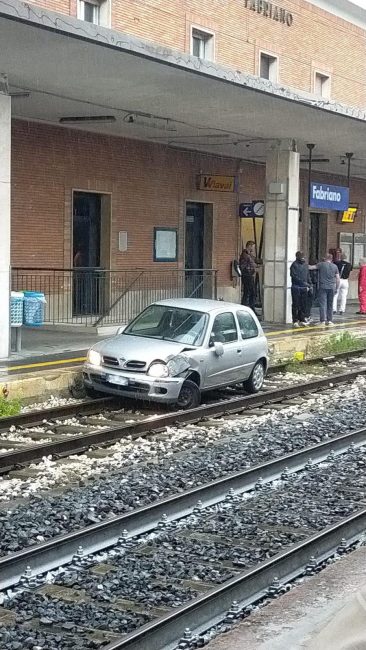 E’ piombata con l’auto, una Micra, dentro la stazione di Fabriano, in Piazzale 20 Settembre, dopo aver sfondato una vetrata per poi attraversare la sala d’aspetto, uscire, e finire sulla banchina numero 1, cadendo lungo le rotaie per rimanere incastrata infine tra le rotaie.
