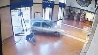 L’auto mentre sfonda la vetrata, urtando un pendolare