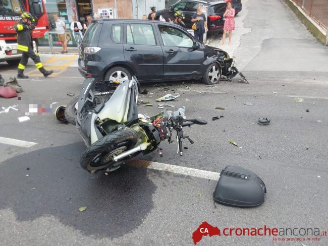 Un violentissimo schianto è avvenuto intorno alle 16 tra uno scooterone che, stando ad una prima ricostruzione della dinamica tuttora in fase di accertamento, procedeva in direzione di Ancona e un’auto che, diretta verso nord, stava svoltando a sinistra per immettersi presumibilmente in un passo.