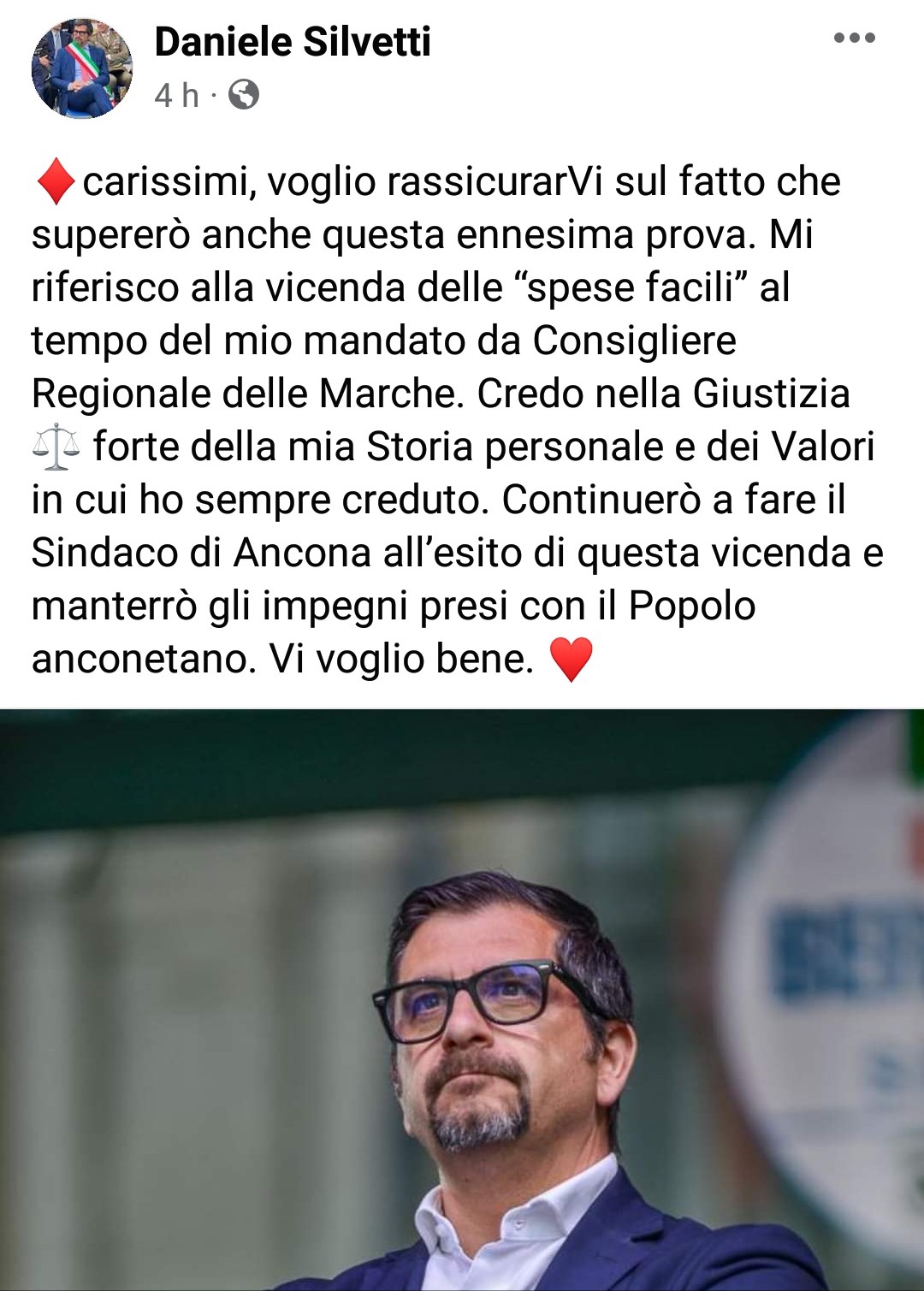 «Carissimi, voglio rassicurarvi sul fatto che supererò anche questa ennesima prova. Mi riferisco alla vicenda delle “spese facili” al tempo del mio mandato da Consigliere Regionale delle Marche». Il sindaco di Ancona, Daniele Silvetti affida ai social il suo messaggio per tranquillizzare i concittadini, dopo la richiesta di condanna per peculato formulata dal Pm Ruggiero Dicuonzo nei confronti di 31 persone, consiglieri regionali  e addetti ai gruppi in carica tra il 2008 ed il 2012.