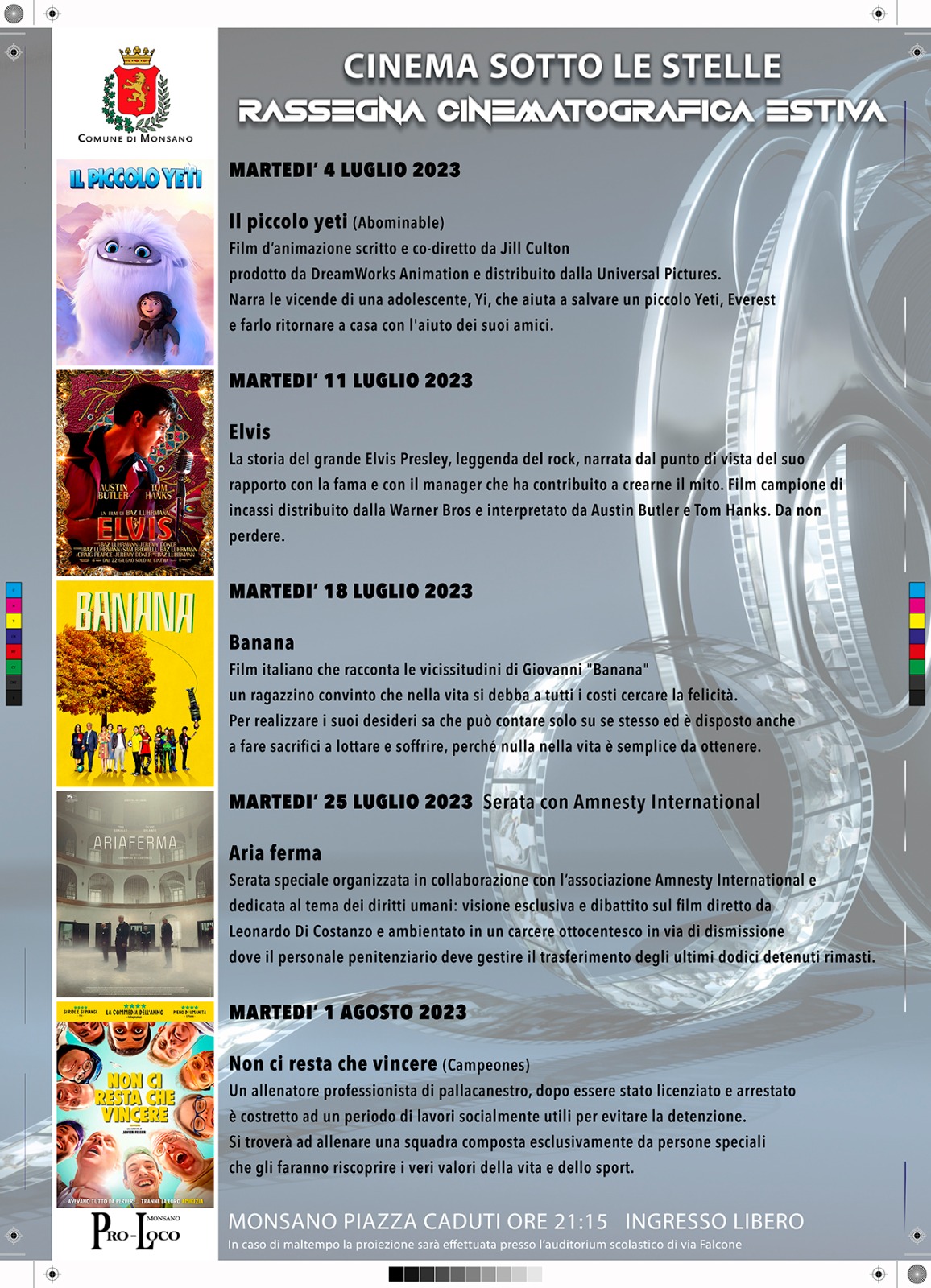 Un’altra estate di “Cinema sotto le stelle” a Monsano. Appuntamento che in questo 2023 taglia il traguardo della nona edizione. La rassegna cinematografica estiva all’aperto, ospitata i martedì sera alle 21.15 nella panoramica piazza Caduti a ingresso gratuito e propone cinque film, dal 4 luglio al 1 agosto, rivolti a un pubblico variegato. Si inizia con la serata bambini con il film di animazione “Il Piccolo Yeti (Abiminable), per proseguire con il recente successo hollywoodiano “Elvis” in programma l’11 luglio. La commedia italiana “Banana”, storia delicata di un adolescente alla ricerca della felicità verrà proiettata il 18 luglio, mentre il 25 è prevista la serata organizzata in collaborazione con con Amnesty International e dedicata al tema dei diritti umani, con il film “Aria Ferma”. Chiuderà la rassegna il primo agosto “Non ci resta che vincere”, film che parla di inclusione e tolleranza.