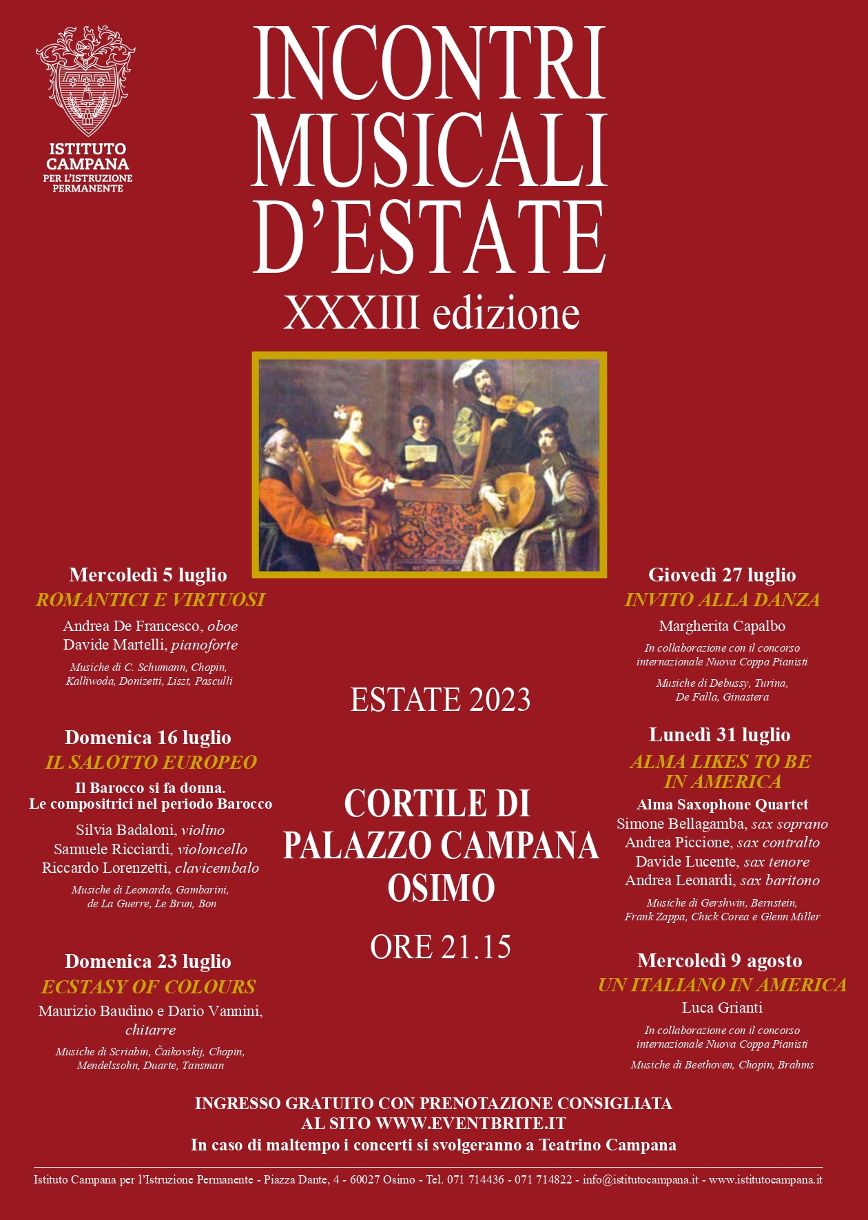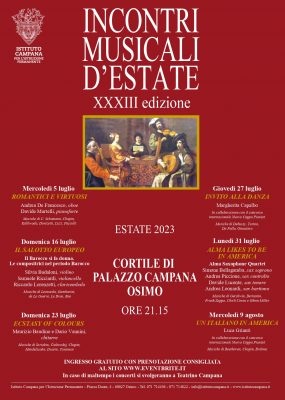 Torna ‘Incontri musicali d’estate’, la storica rassegna dell’Istituto Campana giunta alla 33esima edizione. Da mercoledì 5 luglio alle ore 21.15 riparte nel suggestivo cortile di Palazzo Campana la più longeva rassegna dell’Istituto Campana per l’Istruzione Permanente, con sei concerti di grande qualità a cadenza settimanale. Apre il cartellone “Romantici e virtuosi”, in cui si esibiranno Andrea De Francesco all’oboe e Davide Martelli al pianoforte. Il programma della serata prevede l’esecuzione di brani di Schumann, Chopin, Kalliwoda, Pasculli e Liszt.