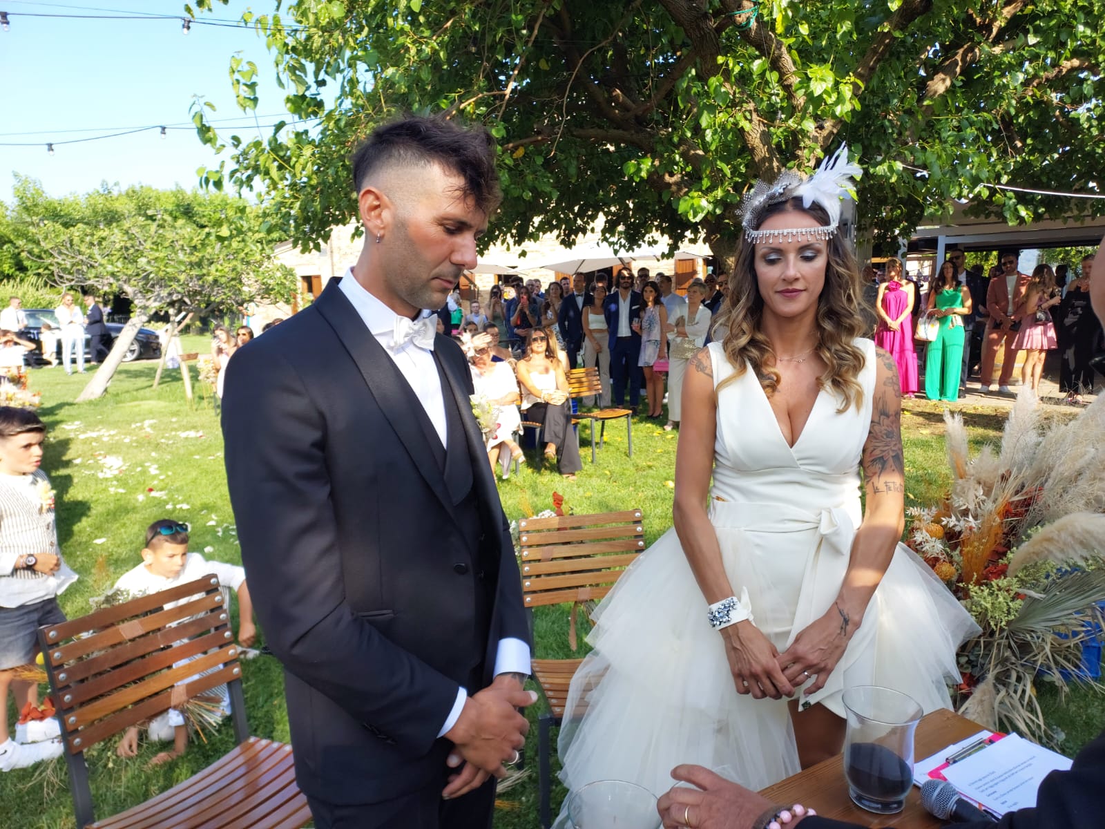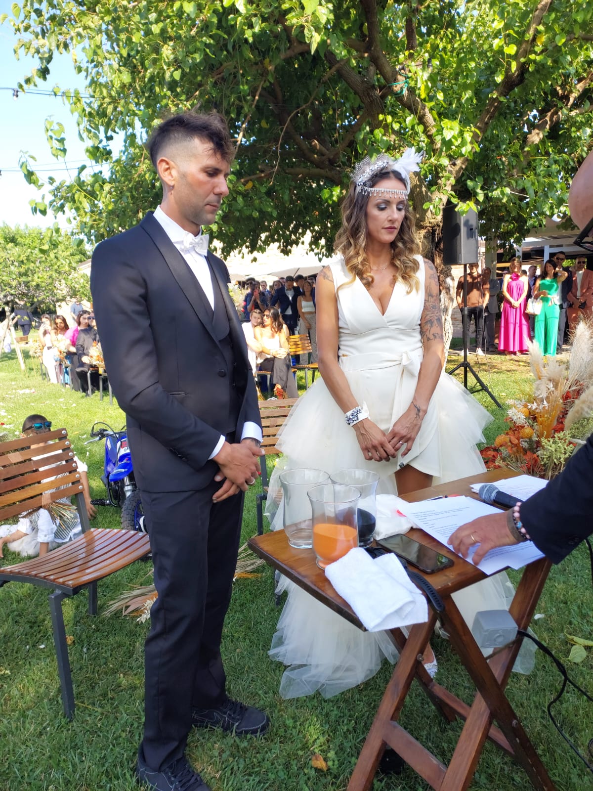 Simone ha impalmato Chiara Todeschini, anche lei seniglliese, con la quale già conviveva ma la coppia voleva formalizzare questa unione e, nell’intervallo tra una gara e l’altra, ha compiuto il grande passo con lo scambio degli anelli e la promessa d’amore. Il matrimonio è stato celebrato con rito civile nel parco del ristorante, dove si è svolto anche il banchetto. Vicino agli sposi si sono accomodati i testimoni: la sorella e il cognato per Simone; per Chiara le sue sorelle. Dopo qualche momento di commozione e tanti applausi, è esplosa l’allegria per suggellare questo momento indimenticabile.