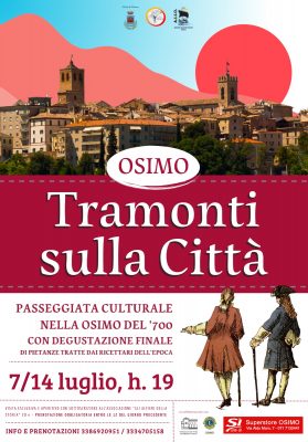 In attesa di ‘Rivivi ‘700’ la rievocazione storica di agosto nell’edizione numero nove che celebrerà i 300 anni dalla battaglia di Anzio a seguito della quale il conte Guarnieri consegnò la fiamma turca in Duomo, ad Osimo una nuova iniziativa targata ‘Gli Alfieri della Storia’ sarà messa in campo nei primi due venerdì di luglio (7 e 14). Si tratta di ‘Tramonti sulla città’, ovvero una visita alla città settecentesca, curiosando tra i suoi segreti, accompagnati dalla luce del tramonto.