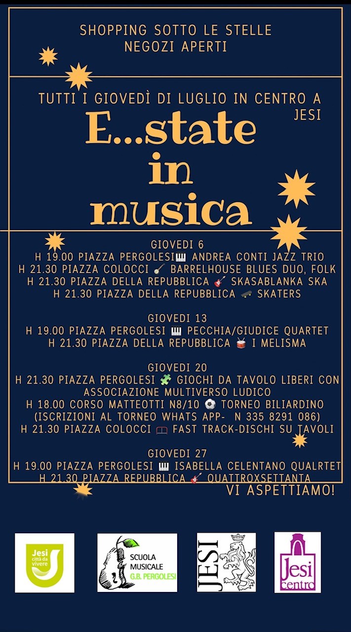 ‘ E…state in musica’ propone a Jesi per tutti giovedì di luglio una ricca agenda di appuntamenti anche con lo shopping sotto le stelle. La manifestazione, promossa dagli esercenti del consorzio ‘Jesi Centro’ in collaborazione con la Scuola musicale ‘Pergolesi’ e ‘Jesi città da Vivere’, vanta il patrocinio del Comune.