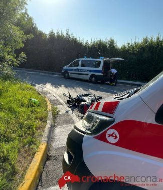 Nello schianto il centauro, un 60enne di Ancona, è stato sbalzato al suolo. Chiamato il 112, sul posto è intervenuta un’ambulanza della Croce Rossa.