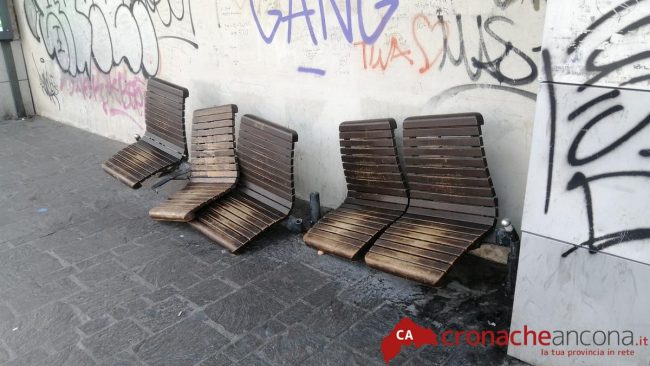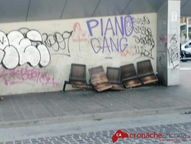 Sulla sinistra, sotto la pensilina, le sedute sfasciate e lasciate così da mesi