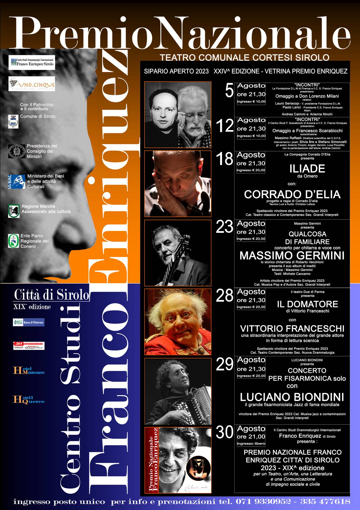 Ricco il cartellone di appuntamenti della XIX edizione del Premio Franco Enriquez che, si svolgerà, a Sirolo il prossimo 30 agosto. Motto di quest’anno è: “Per una poesia del Teatro e un teatro della poesia” . Nel 2023 verrà assegnato il riconoscimento alla carriera a Filippo Timi, regista e attore, e a Elena Mannini, costumista e scenografa, al regista Giancarlo Nicoletti, per la riscrittura e la messinscena “I due Papi” e a Giorgio Colangeli, miglior attore, dello stesso spettacolo, a Agnese Fallongo, autrice e interprete di “I Mezzalira” con il Teatro degli Incamminati, a Michele Placido miglior attore per lo spettacolo “La bottega del Caffè” di C. Goldoni, a Claudio Casadio miglior attoreIN de “ L’ Oreste” della compagnia Accademia Perduta Romagna Teatro e a Corrado D’Elia per “L’Iliade” (riscrittura) del poema omerico. E ancora un riconoscimento allo scrittore di teatro e straordinario attore Vittorio Franceschi, il premio per la drammaturgia per la novità assoluta: “Il Domatore”, produzione del Teatro Due di Parma e del Centro Teatrale Bresciano, a Valter Malosti per la direzione artistica di Etr Emilia-Romagna Teatro Fondazione, a Mariano Rigillo per la direzione artistica del teatro Ciak di Roma. Infine un premio in memoria e nel centenario della nascita di don Lorenzo Milani alla Fondazione don Lorenzo Milani di Firenze e un riconoscimento all’opera encomiabile e duratura dell’Accademia d’Arte Drammatica Silvio D’Amico di Roma. Invece, nella sezione fotografia e cinema troviamo al fotografo e regista Lorenzo Cicconi Massi.