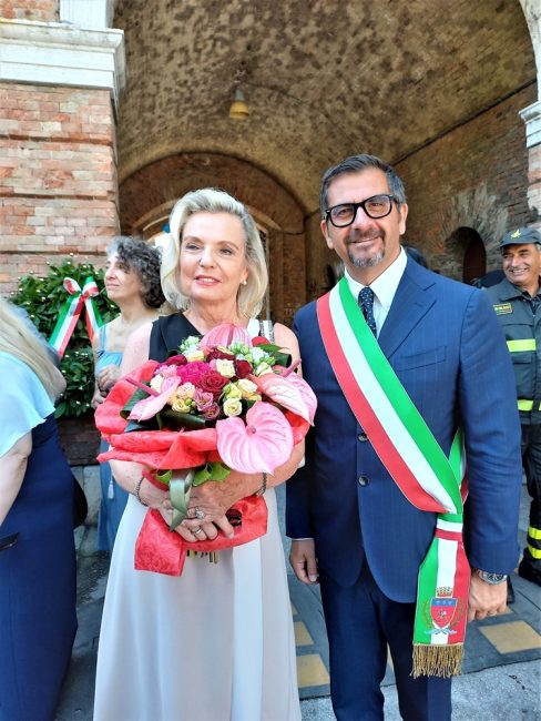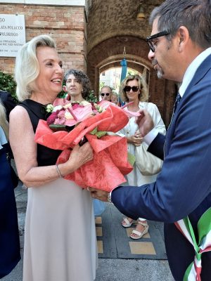 Il sindaco di Ancona Daniele Silvetti dona un bouquet di fiori a Anna Maria Anders, figlia del generale che liberò la città esattamente 79 anni fa