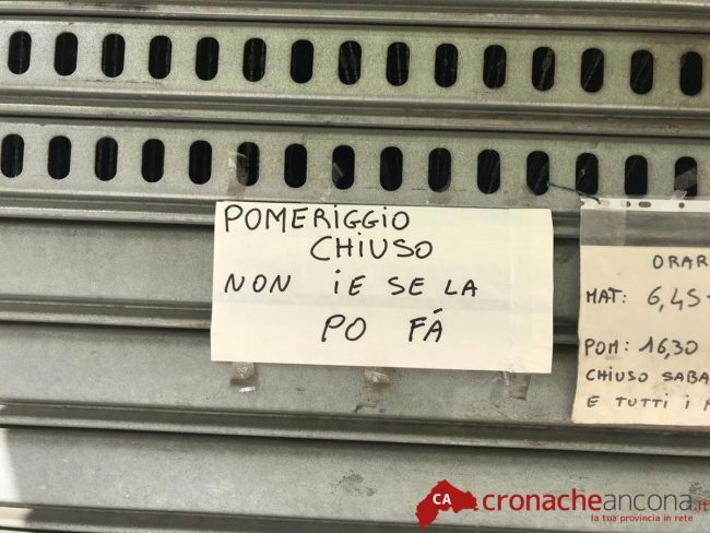 E così, camminando per il Piano, cercando di raggiungere un supermercato dove trascorrere una mezz’ora uscendo poi con surgelati che non si mangeranno mai ma che serviranno solo a mo’ di borse del ghiaccio che durino per il tempo necessario a raggiungere il portone di casa, ecco che si incappa nella saracinesca abbassata di una pizzeria storica di via Torresi dove la proprietaria, giustamente, e come si dice ad Ancona, questa volta “Ne vole poghe”.