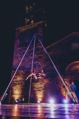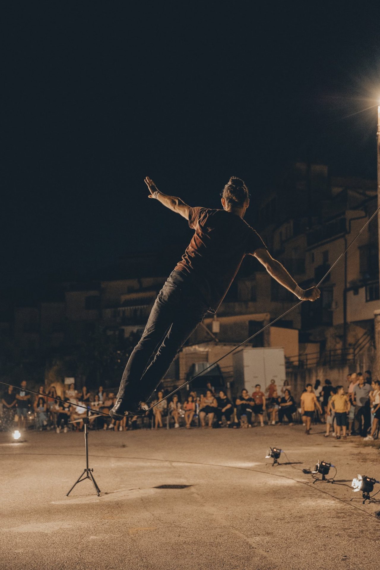 Il linguaggio del circo contemporaneo è il trait d’union per avvicinare il pubblico all’ambientalismo attraverso l’universo creativo di Italo Calvino e l’attenzione all’ecologia, tema presente in molte delle sue opere. All’interno dello spettacolo prendono vita diverse discipline circensi e riadattamenti della giocoleria in uno scenario che vuole richiamare l’ambivalenza tra cielo e terra, temi molto vividi tra le pagine di Calvino soprattutto nelle Cosmicomiche. Il Collettivo si ispira alla struttura del romanzo Se una notte d’inverno un viaggiatore, libro composto da undici incipit di ipotetici romanzi, dieci dei quali sono inseriti all’interno di una cornice. La storia della cornice, che si sviluppa parallelamente alla lettura dei diversi incipit, racconta una storia d’amore a cui segue uno schema narrativo tradizionale. Il finale dello spettacolo è legato, invece, alla Memoria, per diffondere consapevolezza e lasciare un segno nello spettatore.