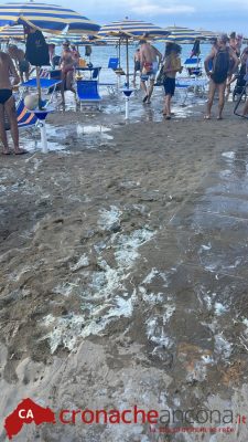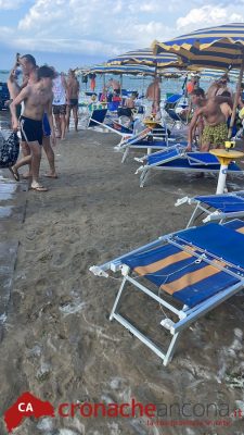 Due onde anomale, una quasi di seguito all’altra, intorno alle 17.45 si sono allungate fino ad arrivare alla settima fila di ombrelloni sulla spiaggia di Palombina, seguite da grandi folate di vento.