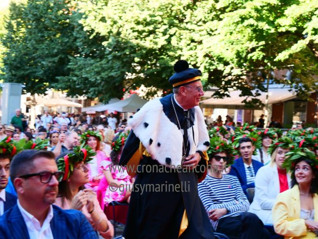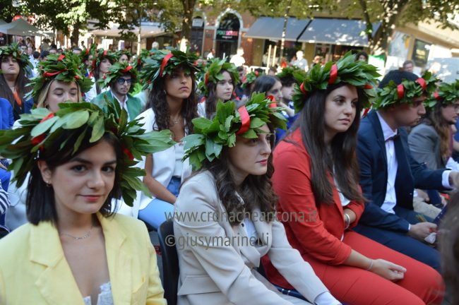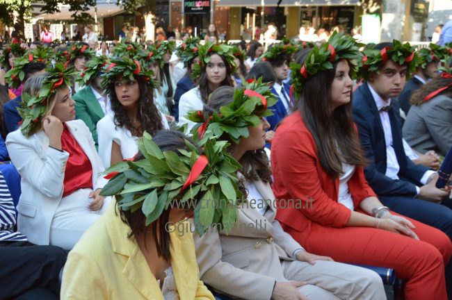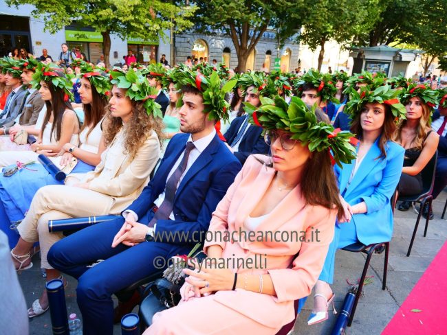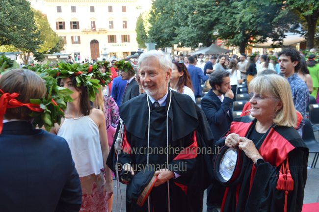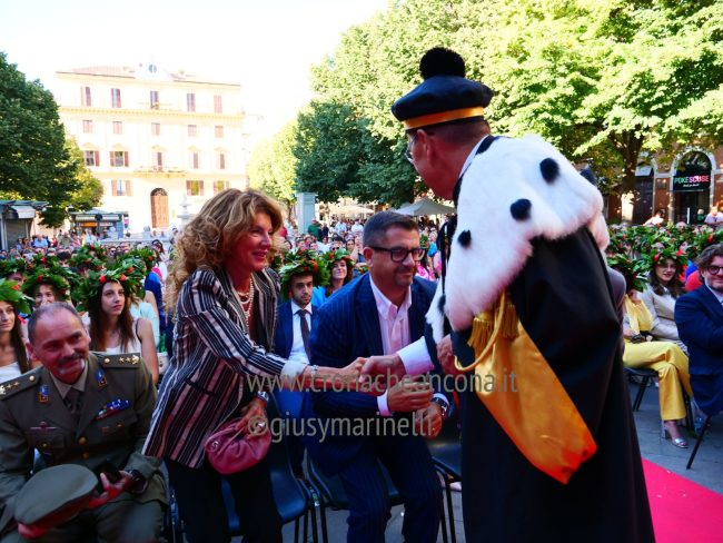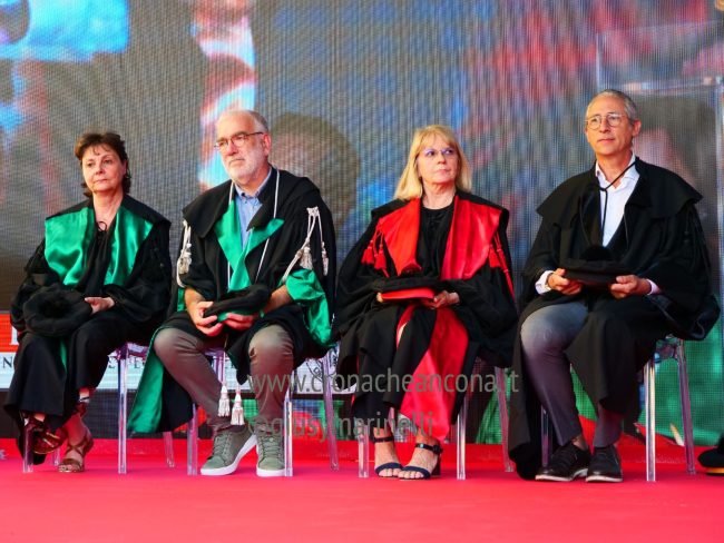 Sullo scranno, posto sopra il grande palco situato davanti allo storico Rettorato di corso Stamira, il primo a prendere parola attorno alle 18 è stato il Magnifico Rettore Gian Luca Gregori: «Grazie a tutti per essere qui con noi in quella che è una delle giornate più importanti nella vita di questi ragazzi. Eventi come questi rappresentano la perfetta simbiosi tra noi docenti, gli studenti e la città tutta di Ancona. Complimenti quindi a tutti voi. Perché da noi – ribadisce con orgoglio il professor Gregori – si esige una preparazione rigorosa. Non è facile, ma voi ce l’avete fatta. Ma i complimenti – apre una parentesi il Rettore – vanno fatti anche ai vostri genitori che vi hanno sostenuto, permettendovi di studiare e che hanno affidato a noi il loro bene più prezioso: vale a dire voi. I nostri figli».