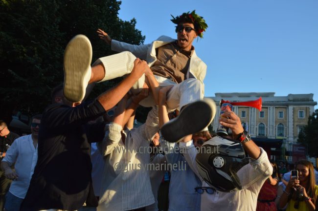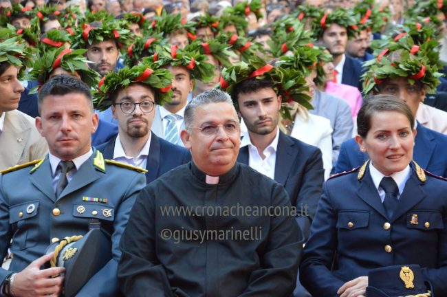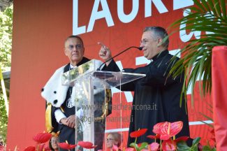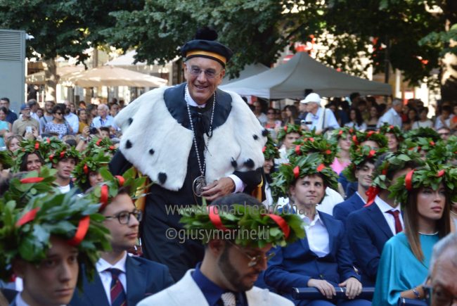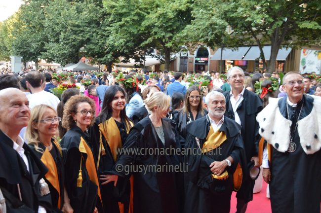 Anche questo pomeriggio ad aprire la serie dei discorsi dallo scranno posto sopra il palco, alle 18 come ieri, è stato il Magnifico Rettore Gianluca Gregori che dando il benvenuto a tutti non ha potuto non notare come «Piazza Roma così è stupenda. È davvero una grande emozione anche per noi vedervi qui con questo splendido colpo d’occhio in questa giornata per voi così importante e che ricorderete per tutta la vita».