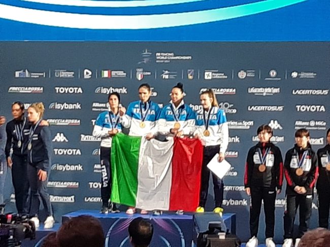 Il podio azzurro del Fioretto femminile a squadre con con Francesca Palumbo, Arianna Errigo, Alice Volpi e Martina Favaretto