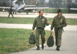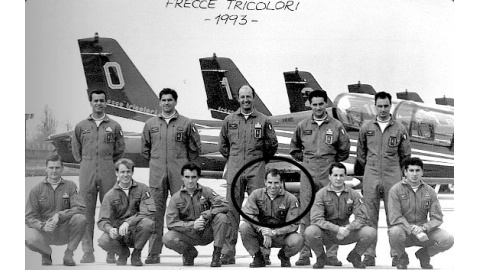 Una vecchia foto delle Frecce Tricolori, nel tondo Stefano Rosa