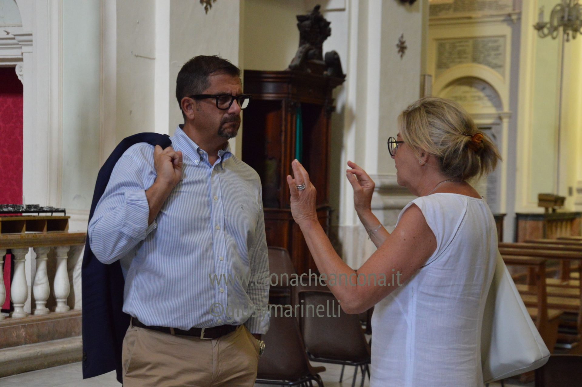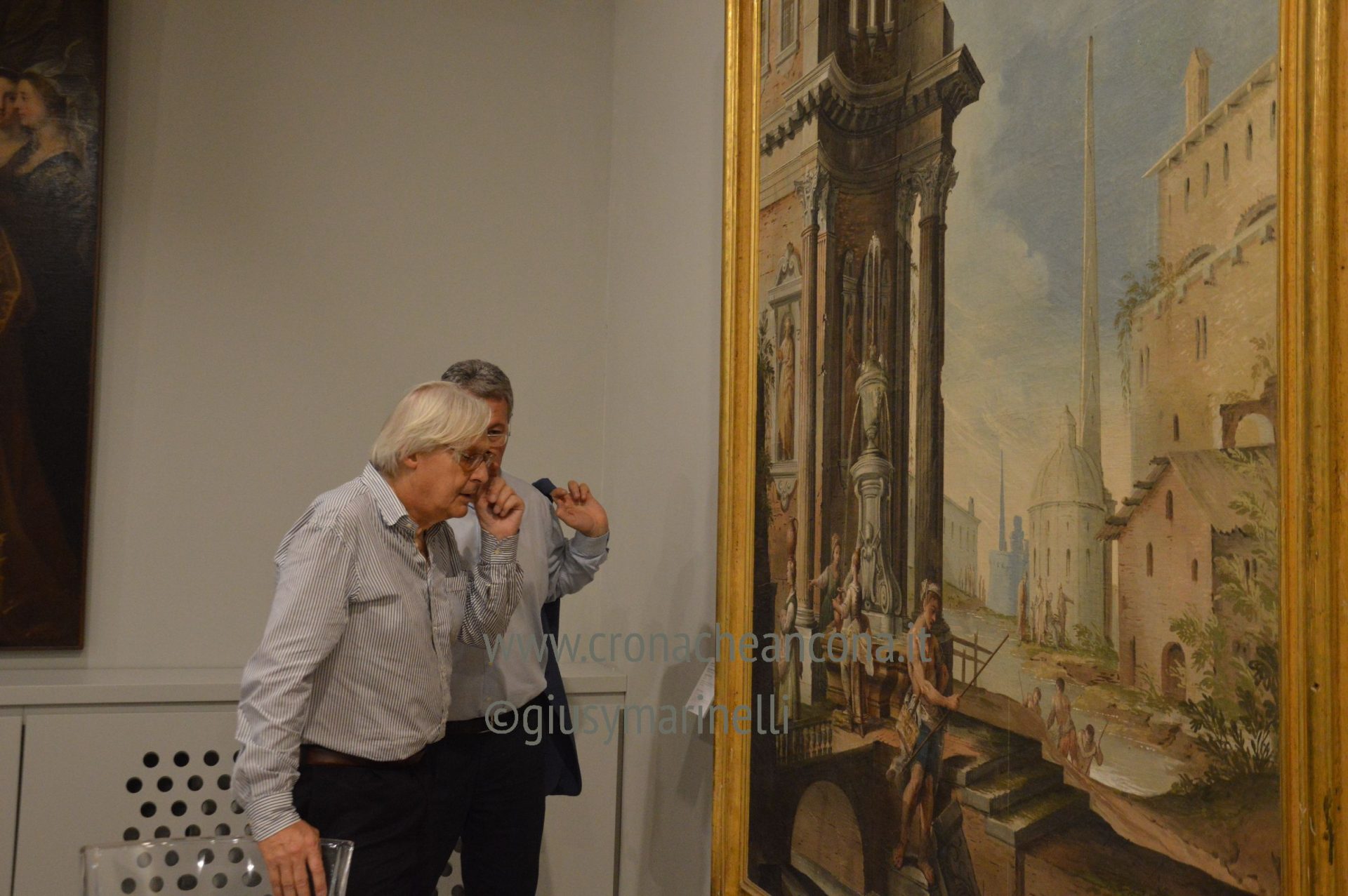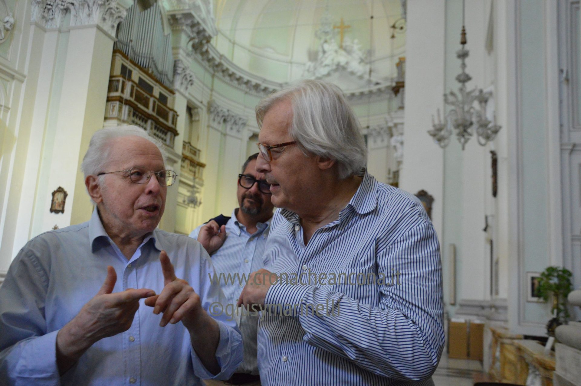 «L’odio per Ancona non c’è mai stato. – ha chiarito subito l’onorevole al margine della visita nella chiesa – C’era piuttosto una città strana, dove ogni attività culturale sembrava impermeabile alla città e la città ad essa. Nel tempo ho fatto una infinità di cose in tutti i luoghi delle Marche, da Matelica a San Severino, da Osimo a Jesi, a Caldarola, a Urbino e a Pesaro ma mai qui. Ora in memoria dello studioso Pietro Zampetti da molto tempo dicevo agli amministratori della Regione che bisognava allestire una mostra sul Rinascimento Adriatico che non è mai stato documentato nel percorso da Venezia alla Puglia. La città che avrebbe dovuto ospitarla sarebbe stata Ancona. Una proposta caduta sempre nel vuoto. Con la vittoria del centro destra e del sindaco Silvetti, nel dialogo con l’assessore, abbiamo ipotizzato una serie di mostre che potrebbero partire già in autunno con le opere del Museo di Rovereto che io presiedo e da qui andare avanti con altre su artisti marchigiani come De Dominicis e Serafini fino ad inaugurare nel 2025 la mostra sul Rinascimento Adriatico con sede espositiva alla Mole Vanvitelliana. L’organizzazione sarà complessa perché dovremo fare arrivare capolavori anche da musei americani come quelli dell’artista Nicola di Maestro Antonio d’Ancona, non marginale ma grande come il Mantegna. Non ci sottrarremo dal sostenere Ancona in tutti i modi nonostante l’orrido e irreparabile teatro delle Muse. Muse tristi e con il muso!» ha scherzato.