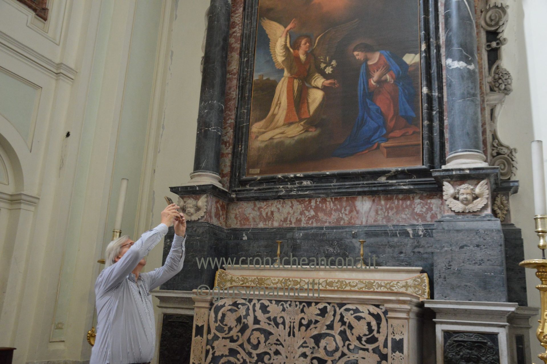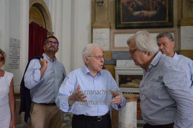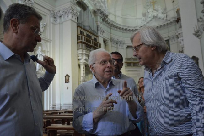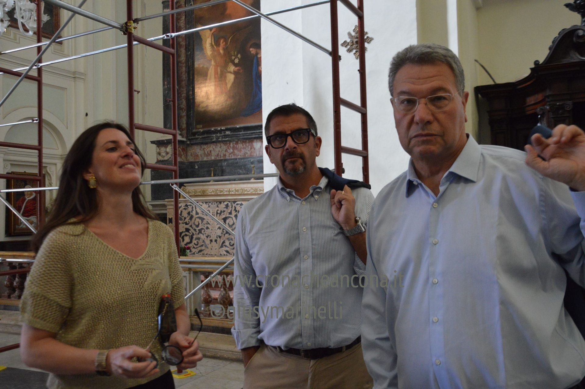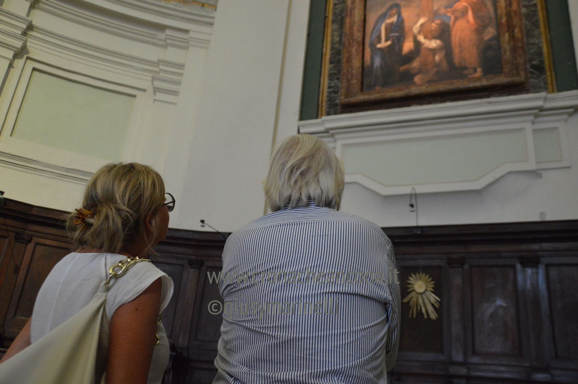 «L’odio per Ancona non c’è mai stato. – ha chiarito subito l’onorevole al margine della visita nella chiesa – C’era piuttosto una città strana, dove ogni attività culturale sembrava impermeabile alla città e la città ad essa. Nel tempo ho fatto una infinità di cose in tutti i luoghi delle Marche, da Matelica a San Severino, da Osimo a Jesi, a Caldarola, a Urbino e a Pesaro ma mai qui. Ora in memoria dello studioso Pietro Zampetti da molto tempo dicevo agli amministratori della Regione che bisognava allestire una mostra sul Rinascimento Adriatico che non è mai stato documentato nel percorso da Venezia alla Puglia. La città che avrebbe dovuto ospitarla sarebbe stata Ancona. Una proposta caduta sempre nel vuoto. Con la vittoria del centro destra e del sindaco Silvetti, nel dialogo con l’assessore, abbiamo ipotizzato una serie di mostre che potrebbero partire già in autunno con le opere del Museo di Rovereto che io presiedo e da qui andare avanti con altre su artisti marchigiani come De Dominicis e Serafini fino ad inaugurare nel 2025 la mostra sul Rinascimento Adriatico con sede espositiva alla Mole Vanvitelliana. L’organizzazione sarà complessa perché dovremo fare arrivare capolavori anche da musei americani come quelli dell’artista Nicola di Maestro Antonio d’Ancona, non marginale ma grande come il Mantegna. Non ci sottrarremo dal sostenere Ancona in tutti i modi nonostante l’orrido e irreparabile teatro delle Muse. Muse tristi e con il muso!» ha scherzato.